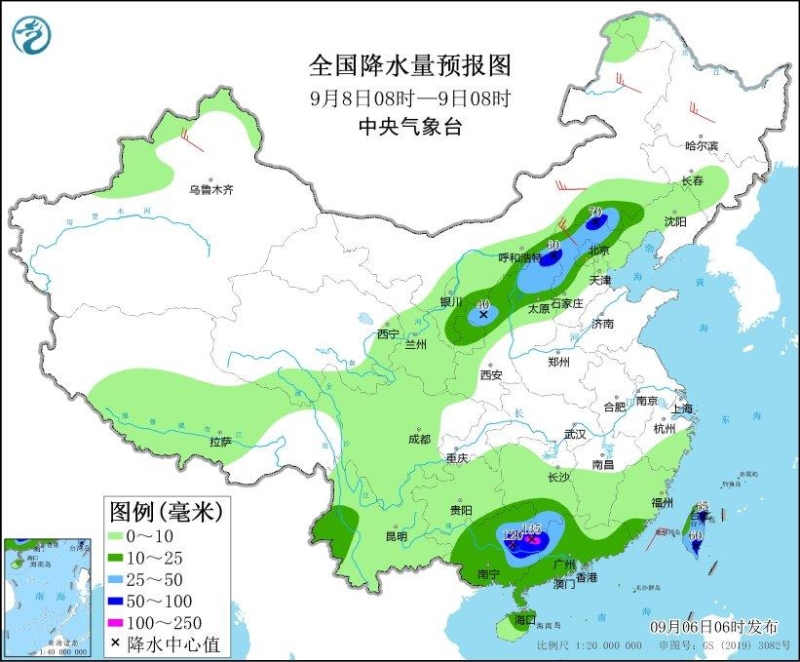9月8日08時(shí)至9日08時(shí),甘肅東北部、陜西北部、內(nèi)蒙古東南部、山西中北部、河北北部和西部、北京大部、廣東大部、廣西大部、湖南南部、臺(tái)灣島等地部分地區(qū)有中到大雨,其中,山西東北部、河北北部、廣西東部、廣東西北部、臺(tái)灣島東部等地部分地區(qū)有暴雨到大暴雨(100~135毫米)。內(nèi)蒙古東部、河北北部等地部分地區(qū)有4~5級(jí)風(fēng)(見圖4)。