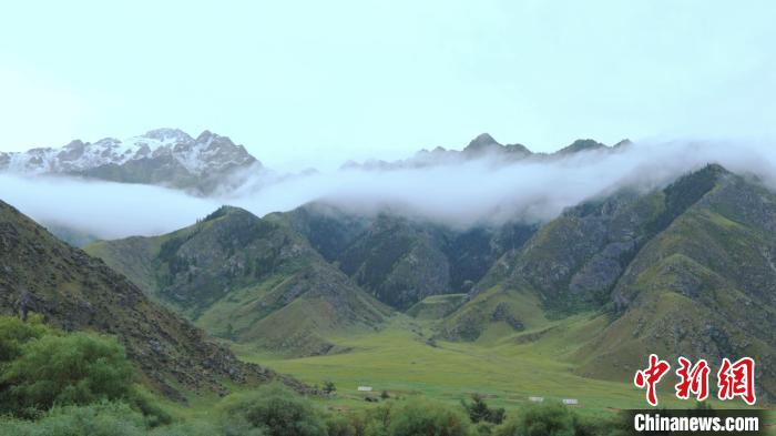 走進(jìn)克爾古提鄉(xiāng),遠(yuǎn)處的雪山在藍(lán)天的映襯下更顯挺拔,群山之上云霧縈繞??_(kāi) 攝