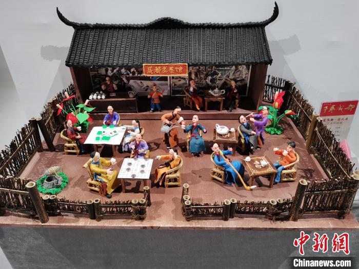 一張長桌、幾把椅子、一個展柜……張龍貴平時就在自家的小院里工作。張龍貴在這里花了近一個月的時間完成了自己的《成都老茶館》作品,這個作品通過面塑的形式,生動還原了成都老茶館內(nèi)的景象。喝茶、掏耳朵、下象棋……張龍貴前往老茶館仔細(xì)觀察了一番,回到家完成了這個有著十多個人物以及數(shù)十個元素的作品。“人物的神態(tài)和衣物上的紋路,都需要細(xì)致入微地處理。”張龍貴表示。