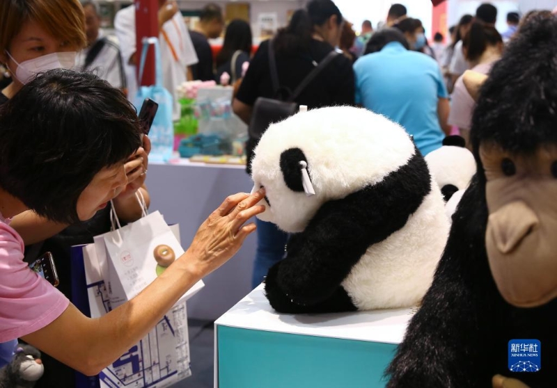 9月6日,參觀者在服貿(mào)會文旅服務(wù)專題展區(qū)觀看北京動物園展臺展出的一款大熊貓玩偶。