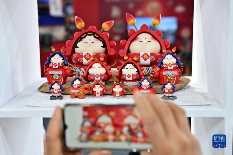 9月6日,參觀者在服貿(mào)會文旅服務(wù)專題展區(qū)拍攝一款兔爺文創(chuàng)產(chǎn)品。