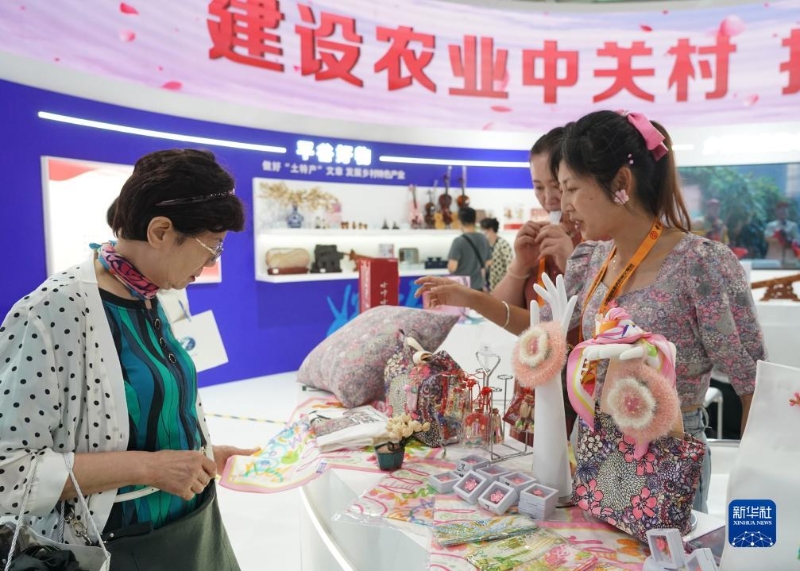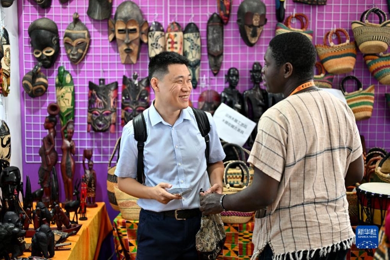 9月6日,一名參觀者在服貿(mào)會文旅服務(wù)專題展區(qū)烏干達(dá)展臺購買手工藝品。