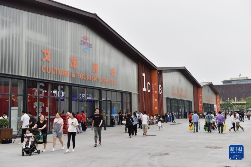 9月2日,在服貿(mào)會首鋼園區(qū),觀眾經(jīng)過文旅服務(wù)展區(qū)。