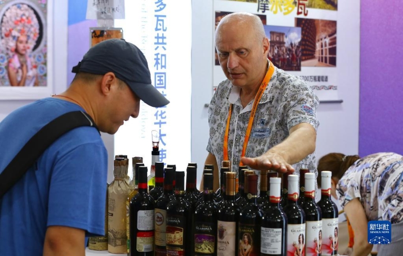 9月6日,參觀者(左)在在服貿(mào)會文旅服務(wù)專題展了解摩爾多瓦葡萄酒。