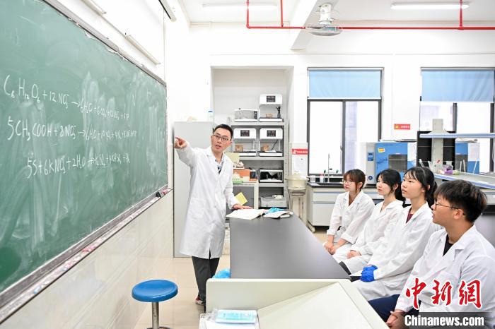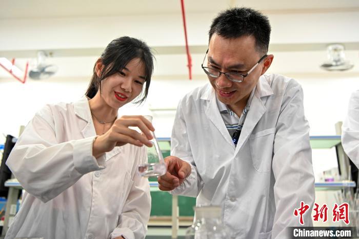 今年6月底,臺灣教師黃崇輔(右)在肇慶學院指導學生做實驗。中新社記者 陳驥旻 攝