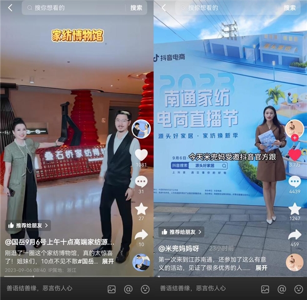 本次活動,抖音電商還邀請到了上百位達人進行溯源直播,達人將在原產(chǎn)地展開走播、定播和倉播等多形式的直播。通過達人直播,南通的家紡好物將會走進更多用戶的生活里,助力南通產(chǎn)業(yè)帶商家生意增長。
