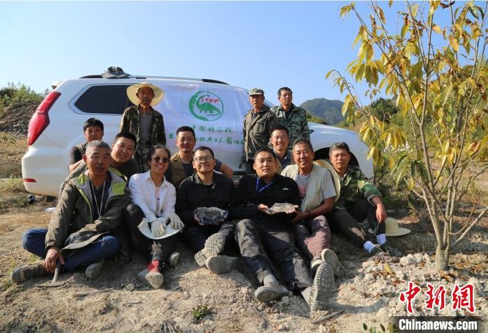 中國科學院古脊椎動物與古人類研究所、福建省地質(zhì)調(diào)查調(diào)查研究院聯(lián)合考察隊發(fā)現(xiàn)“奇異福建龍”化石標本后合影。王敏 供圖