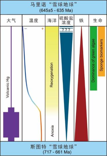新元古代“雪球地球”事件,分別為斯圖特“雪球地球”和馬里諾“雪球地球”,前者持續(xù)了大約5600萬年,后者持續(xù)了大約1000萬年。在“雪球地球”時期,大氣和海洋之間幾乎缺乏物質(zhì)交換,但持續(xù)數(shù)百萬年的火山活動釋放了大量的二氧化碳,形成了超級“溫室效應”,從而導致“雪球地球”的迅速消融。