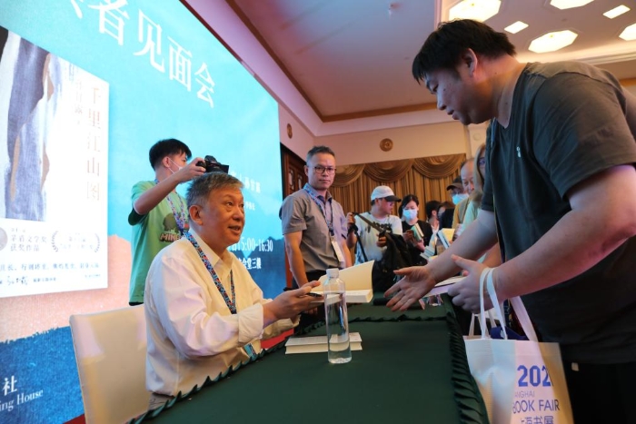 茅盾文學(xué)獎新科得主孫甘露在《千里江山圖》讀者見面會簽售書籍。
