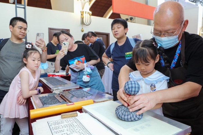 小朋友在上海書展現(xiàn)場體驗活字印刷。