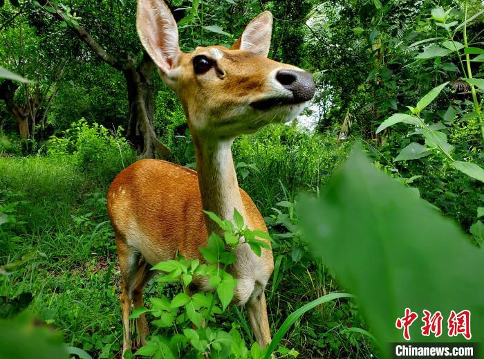 海南坡鹿性情溫順。在大田保護(hù)區(qū),經(jīng)馴養(yǎng)的坡鹿不怕生人靠近。中新網(wǎng)記者 王曉斌 攝