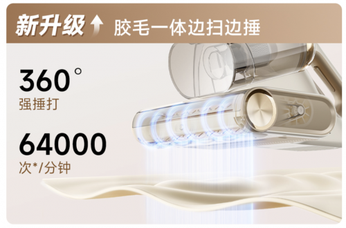 同時(shí),錘頭式膠毛一體刷條配合64000次/分鐘的仿人工深層錘打,再頑固的塵螨也能輕松震出來。再結(jié)合16000Pa的颶風(fēng)吸力,輕松吸走床鋪表面及拍打出來的塵螨,除螨率高達(dá)99.99%。