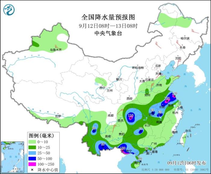 9月12日08時至13日08時,重慶大部、貴州東部、河南東南部、湖北大部、湖南大部、安徽、江蘇、江西北部以及云南大部、廣西大部、廣東南部、海南島等地部分地區(qū)有中到大雨,其中,重慶東南部、湖北東部、湖南西部、蘇皖中部、江西北部、云南西北部和南部、廣西西南部等地部分地區(qū)有暴雨或大暴雨(100~120毫米)。內(nèi)蒙古東部、東北地區(qū)、四川盆地、貴州西部等地部分地區(qū)有4~6級風(fēng)。
