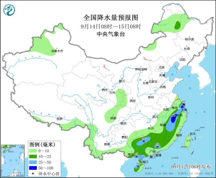 9月14日08時至15日08時,江蘇南部、浙江中西部、上海、江西東部和南部、湖南南部、福建中西部、廣西中東部、廣東大部、海南島北部等地部分地區(qū)有中到大雨,其中,江蘇東南部、上海北部、江西北部、浙江西部、江西東北部等地部分地區(qū)有暴雨(50~80毫米)。內(nèi)蒙古中西部等地部分地區(qū)有4~5級風(fēng)。