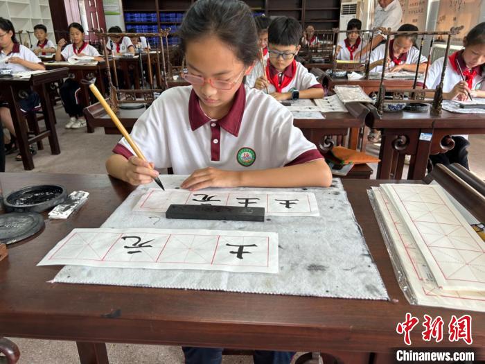 山東臨沂,臨沭縣光明路小學,學生在書法教室里寫下土元、杜仲等中藥材名稱。國璇 攝
