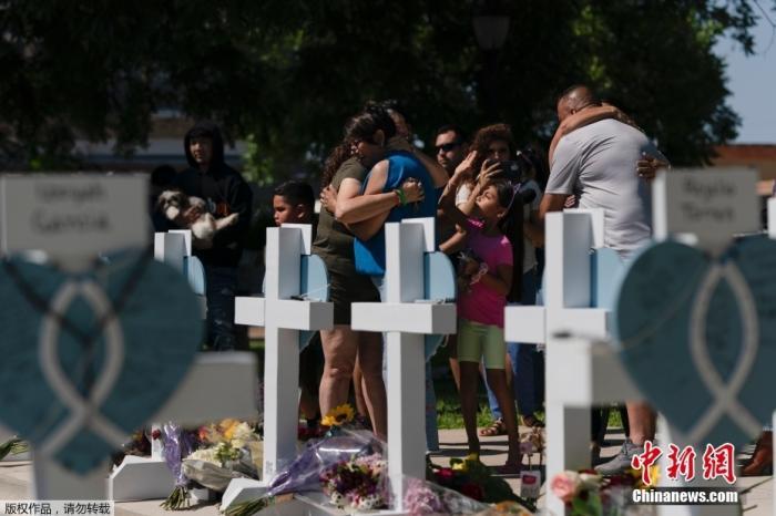 資料圖:當(dāng)?shù)貢r間2022年5月26日,美國得克薩斯州尤瓦爾迪市,民眾悼念小學(xué)槍擊案遇害者。