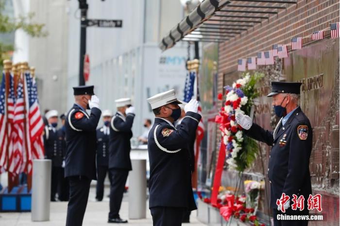 當(dāng)?shù)貢r間2020年9月11日,在紐約市消防局9·11遇難消防員紀(jì)念墻前,消防員向死難同事表達(dá)哀悼和敬意。 中新社記者 廖攀 攝