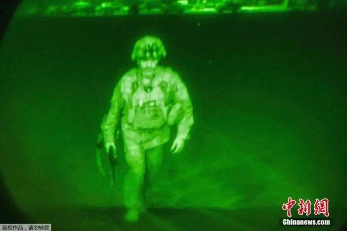 資料圖:2021年8月30日,美國陸軍第82空降師、第18空降兵團(tuán)指揮官克里斯·多納休少將登上運輸機。他是最后一位離開阿富汗的美國軍人。