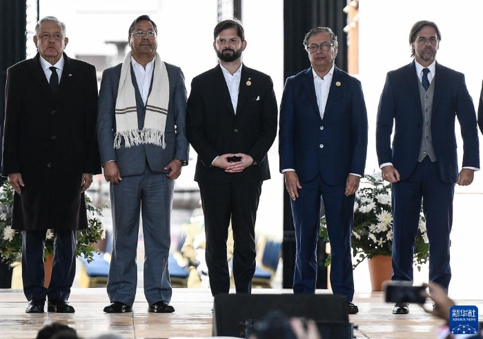 9月11日,在智利首都圣地亞哥,墨西哥、玻利維亞、智利、哥倫比亞和烏拉圭5國(guó)總統(tǒng)共同出席悼念活動(dòng)。新華社發(fā)(豪爾赫·比列加斯攝)