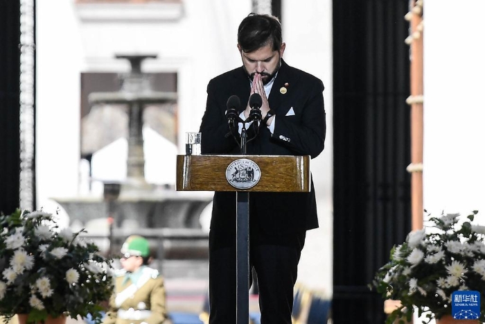 9月11日,在智利首都圣地亞哥,智利總統(tǒng)博里奇出席悼念活動(dòng)。新華社發(fā)(豪爾赫·比列加斯攝)