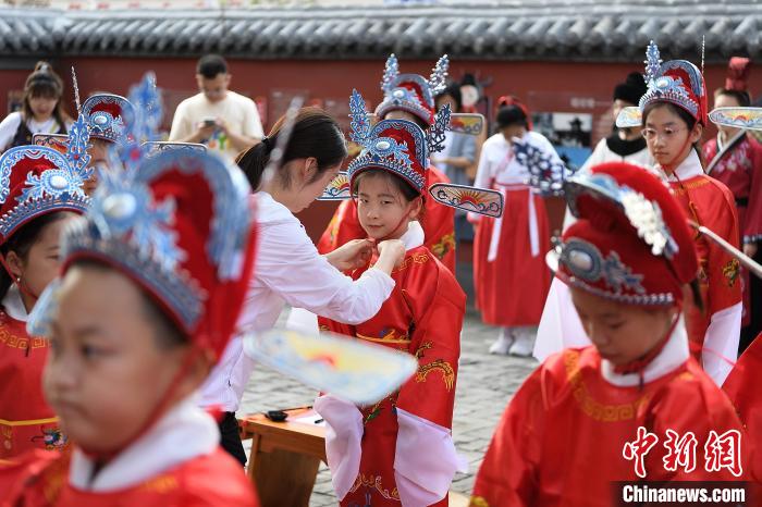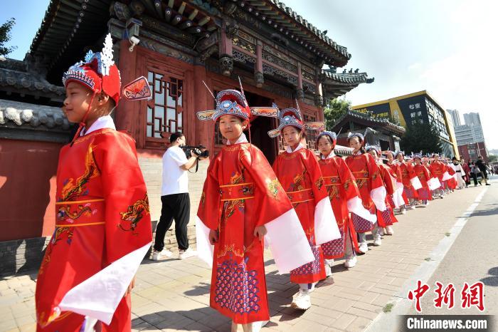 中新網(wǎng)太原9月12日電(高雨晴 胡健)正衣冠、啟蒙描紅、朱砂啟智……一場富有中華傳統(tǒng)文化特色的“開筆禮”12日在山西太原唱經(jīng)樓內(nèi)舉行,數(shù)十名小學生身著狀元服,“沉浸式”體驗古代學子的“開學典禮”。