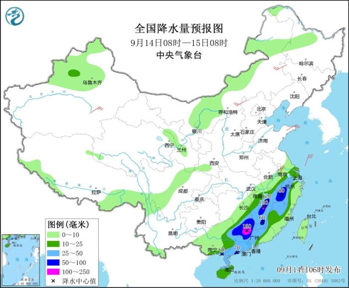 預(yù)計(jì),9月14日08時(shí)至15日08時(shí),安徽南部、浙江西部和北部、湖南東南部、江西東北部和中南部、福建西北部、廣東中西部、廣西東部等地部分地區(qū)有大到暴雨,其中,江西中部、廣東西北部等地部分地區(qū)有大暴雨(100~150毫米)。上述部分地區(qū)伴有短時(shí)強(qiáng)降水(最大小時(shí)降雨量30~50毫米,局地可超過(guò)60毫米),局地有雷暴大風(fēng)等強(qiáng)對(duì)流天氣。中央氣象臺(tái)9月14日06時(shí)繼續(xù)發(fā)布暴雨藍(lán)色預(yù)警。