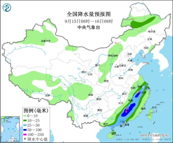 9月15日08時(shí)至16日08時(shí),內(nèi)蒙古東北部、黑龍江西南部、江淮東部和西部、江南中北部和南部、華南中北部和南部等地部分地區(qū)有中到大雨,其中,安徽南部、江西、福建西北部、廣東西北部等地部分地區(qū)有暴雨或大暴雨(100~120毫米)。內(nèi)蒙古東北部和中部、遼東半島等地部分地區(qū)有4~5級(jí)風(fēng)。