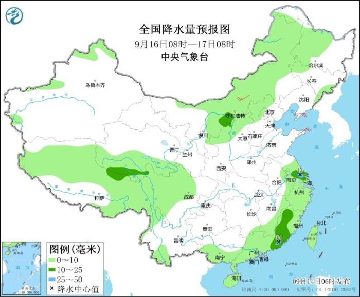 9月16日08時(shí)至17日08時(shí),內(nèi)蒙古東部和西部、黑龍江中西部、吉林西部、新疆北疆北部、西藏大部、西北地區(qū)中部、陜西北部、華北北部、江淮東部、江南中東部和南部、西南地區(qū)北部、四川盆地西北部、華南大部、臺(tái)灣島等地部分地區(qū)有小到中雨,其中,江蘇中南部、廣東東南部等地部分地區(qū)有大雨(25~40毫米)。內(nèi)蒙古中部、遼東半島、山東半島等地部分地區(qū)有4~5級(jí)風(fēng)。