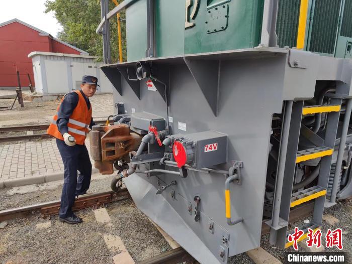 張曉軍同事在檢查中歐班列機(jī)車。姜輝 攝