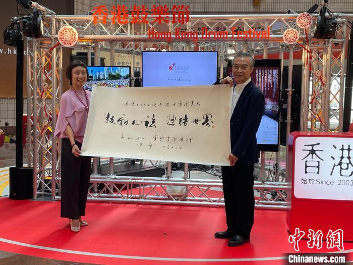 香港鼓樂節(jié)20周年活動贊助商華懋集團(tuán)企業(yè)體驗總裁鐘慧敏(左)向閻惠昌(右)贈送紀(jì)念品。中新網(wǎng)記者 曾平 攝