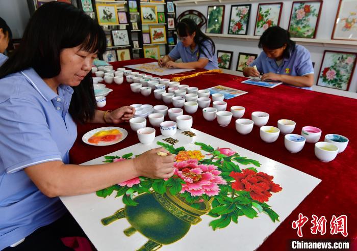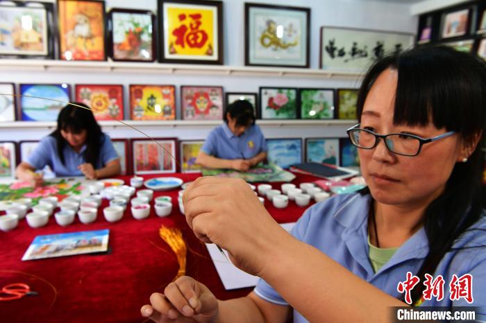 9月13日,河北省承德市興隆縣,技師們正在創(chuàng)作砂畫作品。中新社記者 翟羽佳 攝