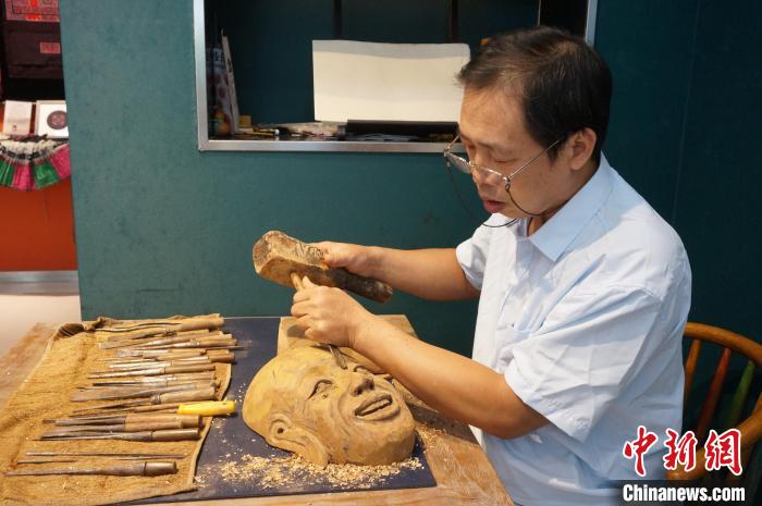 9月6日,桂北儺面具制作技藝代表性傳承人唐江峰在雕刻儺面具。歐惠蘭 攝