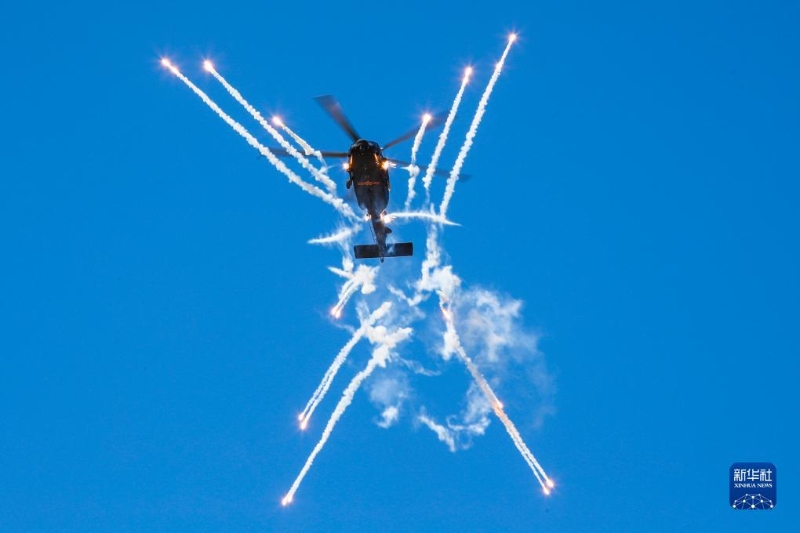 9月14日,在第六屆中國天津國際直升機博覽會開幕式上,陸軍“風雷”飛行表演隊直-20戰(zhàn)術通用直升機發(fā)射干擾彈。