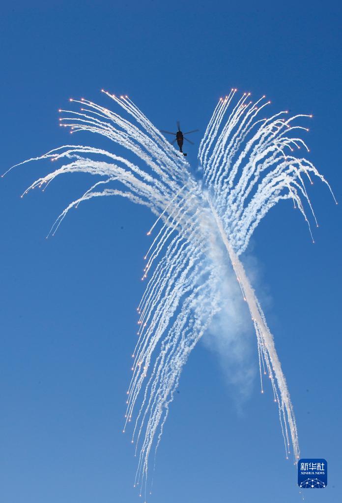 9月14日,在第六屆中國天津國際直升機博覽會開幕式上,陸軍“風雷”飛行表演隊直-10武裝直升機發(fā)射干擾彈。