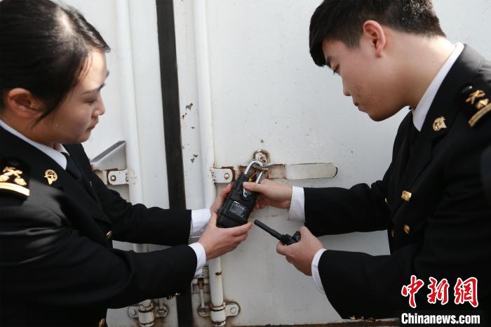 圖為港珠澳大橋海關(guān)關(guān)員對跨境一鎖貨物上的關(guān)鎖進(jìn)行驗核?!∮岵?攝