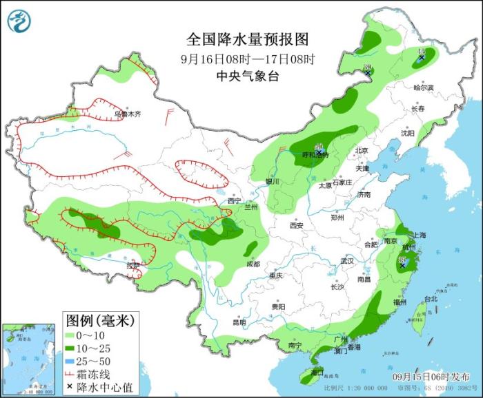 9月16日08時(shí)至17日08時(shí),內(nèi)蒙古中東部、新疆北疆北部、西藏大部、青海中南部、甘肅西南部、寧夏中東部、陜西北部、陜西北部、河北西北部、四川西北部、云南西部和南部、江蘇東部和南部、上海、浙江、福建、江西東北部和南部、廣東大部、廣西中南部、海南島、臺(tái)灣島等地部分地區(qū)有小到中雨,其中,內(nèi)蒙古中部和東北部、黑龍江西部、浙江中北部等地局地有大雨(25~45毫米)。內(nèi)蒙古西部、新疆南疆盆地和東部等地部分地區(qū)有4~6級風(fēng)。