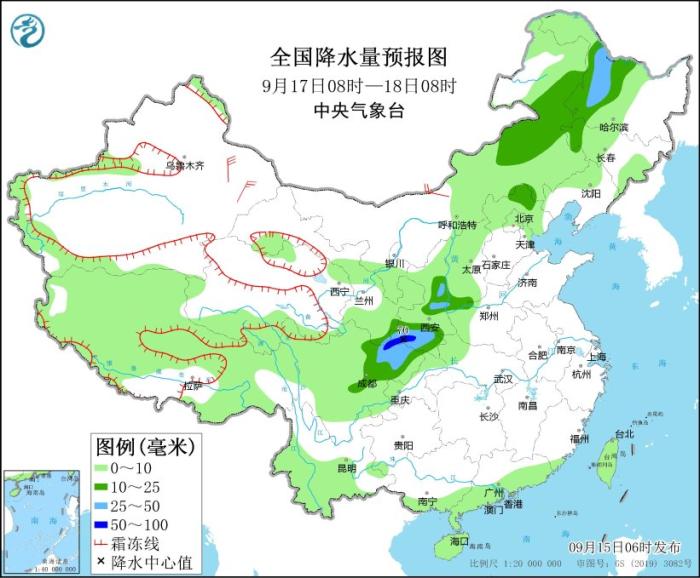 9月17日08時(shí)至18日08時(shí),內(nèi)蒙古東部、黑龍江中西部、吉林西部、河北東北部、陜西中部和西南部、山西南部、四川盆地中北部等地部分地區(qū)有中到大雨,其中,陜西南部、四川盆地北部等地部分地區(qū)有暴雨(50~70毫米)。內(nèi)蒙古中西部、新疆東部等地部分地區(qū)有4~6級風(fēng)。
