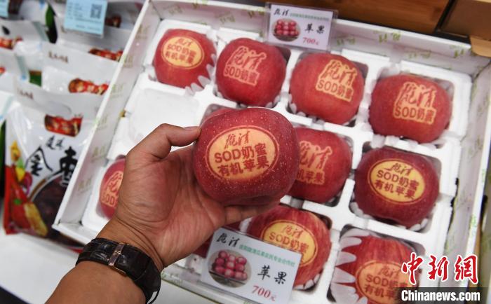 近年來(lái),甘肅蘋(píng)果俏銷(xiāo)共建“一帶一路”國(guó)家和地區(qū)。圖為2018年,甘肅SOD奶蜜有機(jī)蘋(píng)果亮相蘭洽會(huì)。(資料圖)楊艷敏 攝