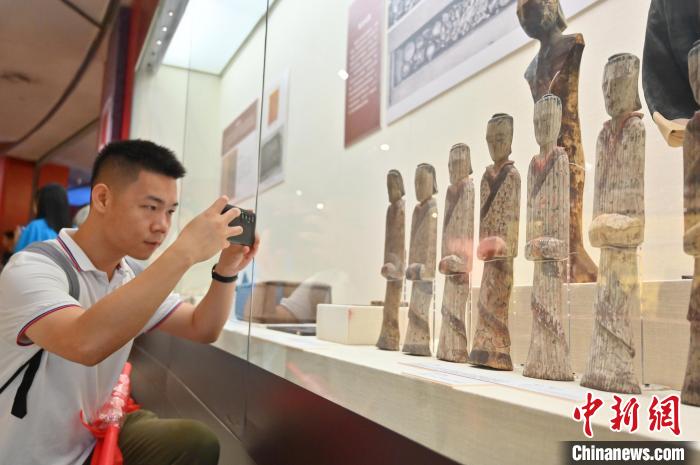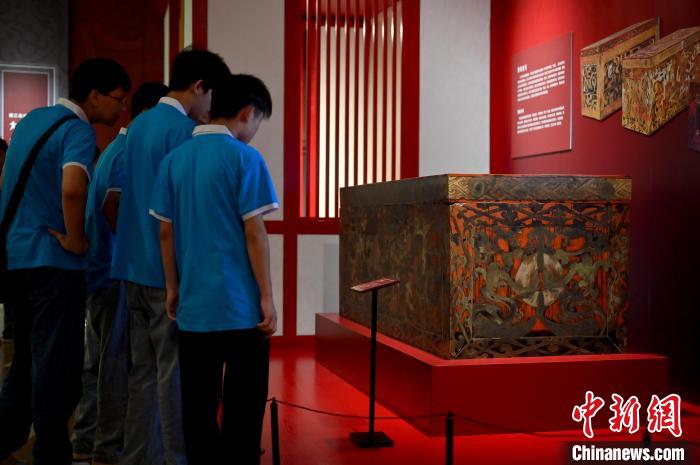 圖為展品朱地彩繪漆棺(復(fù)制品)吸引參觀者。俞靖 攝