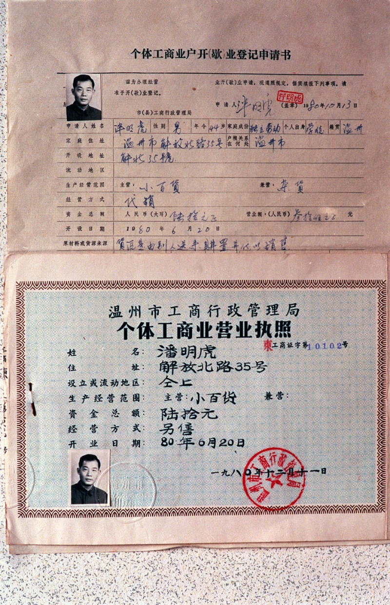 一位溫州個(gè)體戶于1980年填寫的開業(yè)登記申請(qǐng)書和溫州市工商局頒發(fā)的個(gè)體戶營業(yè)執(zhí)照。