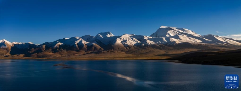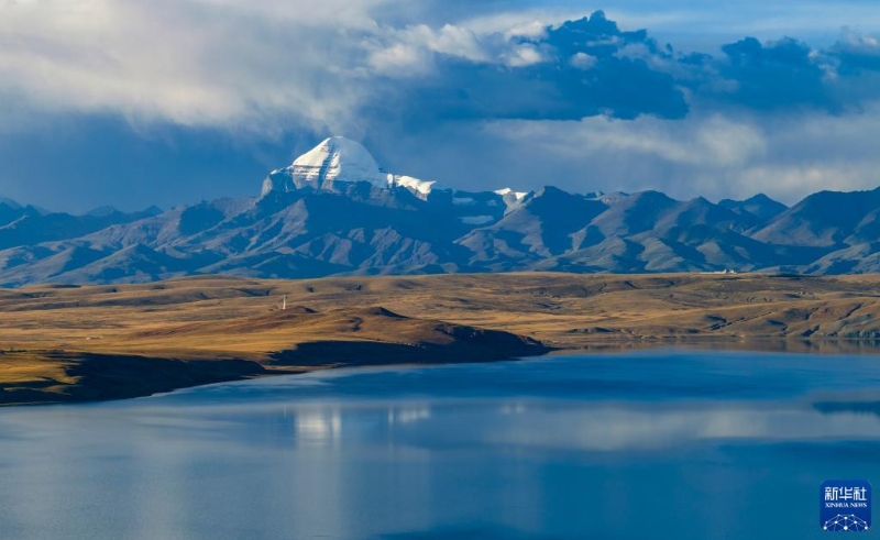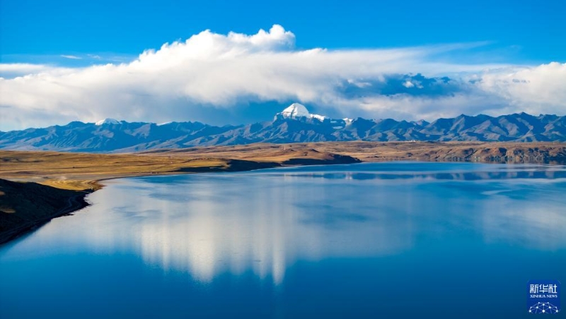 普蘭縣境內(nèi)的瑪旁雍錯,遠處雪山為岡仁波齊(無人機照片,9月13日攝)。