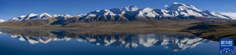 納木那尼雪山倒映在瑪旁雍錯湖面上(無人機照片,9月13日攝)。