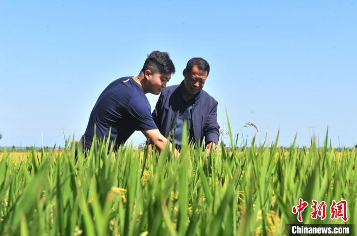 金秋時節(jié),臺胞林駿睿(左)與吉林農民楊萬芳在稻田里觀察水稻。 高龍安 攝