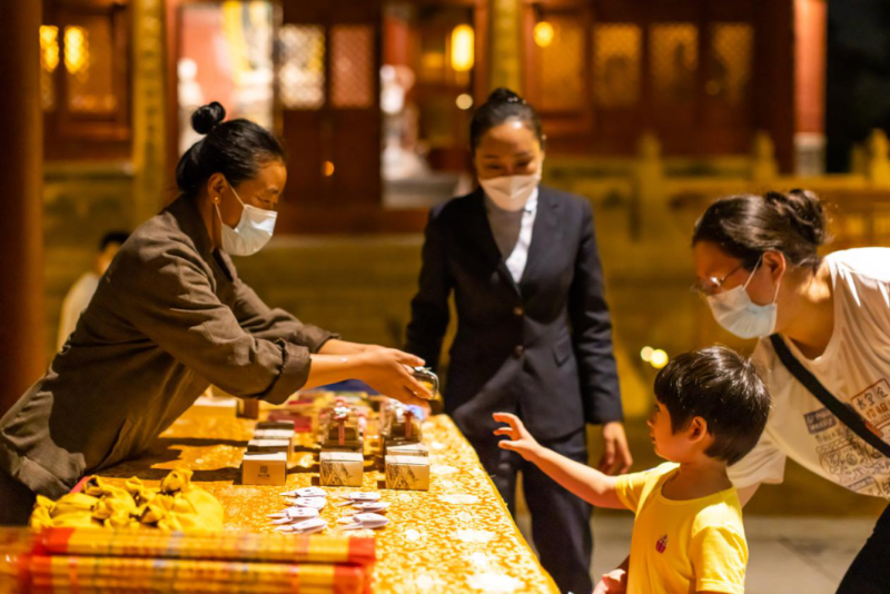 中秋當(dāng)天,圓通塔將免費派發(fā)200枚寄托著中秋祝福的小兔糕,讓您品味傳統(tǒng)美味的同時,感受中秋的溫情。傍晚時分,一場充滿傳統(tǒng)文化魅力的河燈祈?;顒訉⒃谌赵聧u碼頭舉行,河水微波蕩漾,星星點點,放一盞河燈,許一個心愿,祈愿平安幸福。最具矚目的是中秋之夜的無人機孔明燈表演,將在日月島廣場上空變換出美輪美奐的圖案,寓意中秋佳節(jié)團團圓圓的美妙氛圍。