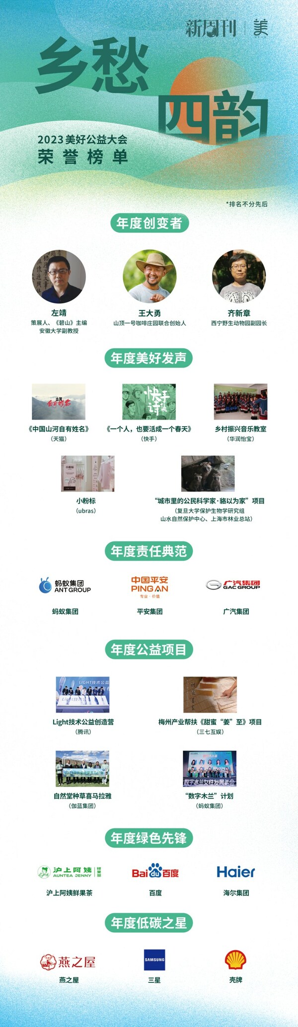 企業(yè)是公益活力與創(chuàng)造力的引擎,更是踐行社會(huì)向善的主力軍。今年的榜單,新周刊關(guān)注到很多企業(yè)正在積極推動(dòng)綠色低碳的創(chuàng)新與發(fā)展,以實(shí)際行動(dòng)助力實(shí)現(xiàn)"雙碳"目標(biāo),并且在ESG和慈善領(lǐng)域,履行著自身的使命。其中,螞蟻集團(tuán)、平安集團(tuán)、廣汽集團(tuán)榮獲"年度責(zé)任典范";滬上阿姨鮮果茶、百度、海爾集團(tuán)榮獲"年度綠色先鋒";燕之屋、三星、殼牌榮獲"年度低碳之星"。