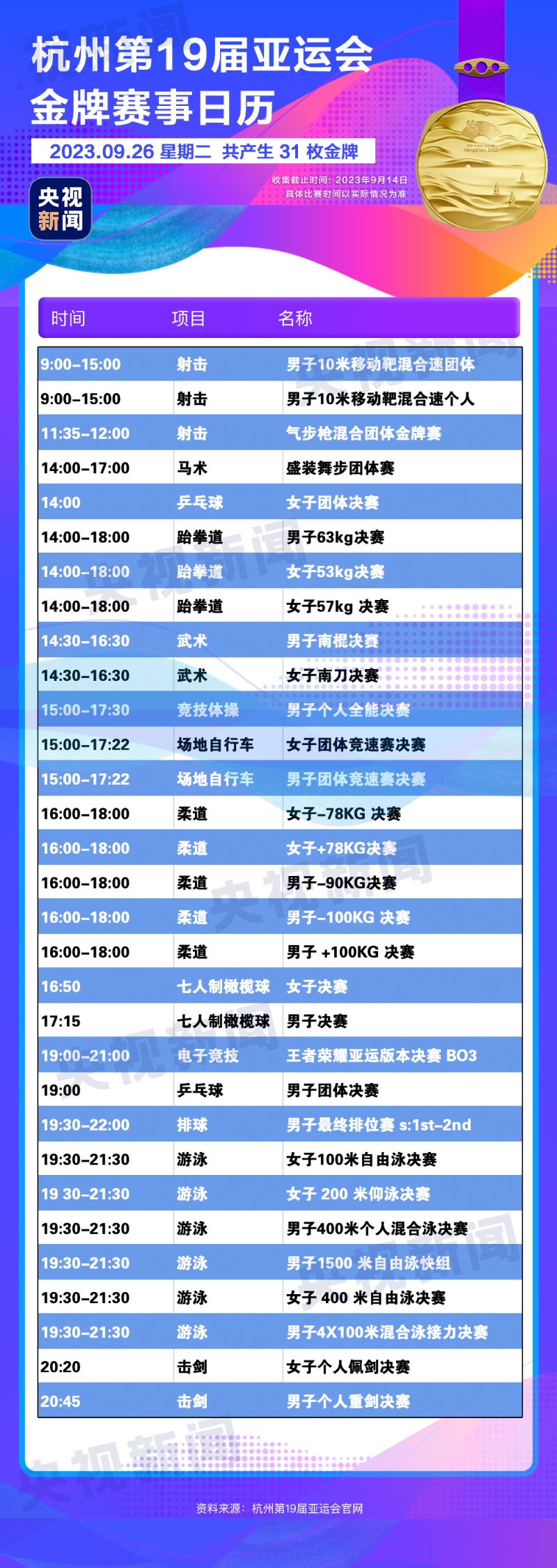 本屆亞運會將產(chǎn)生481枚金牌