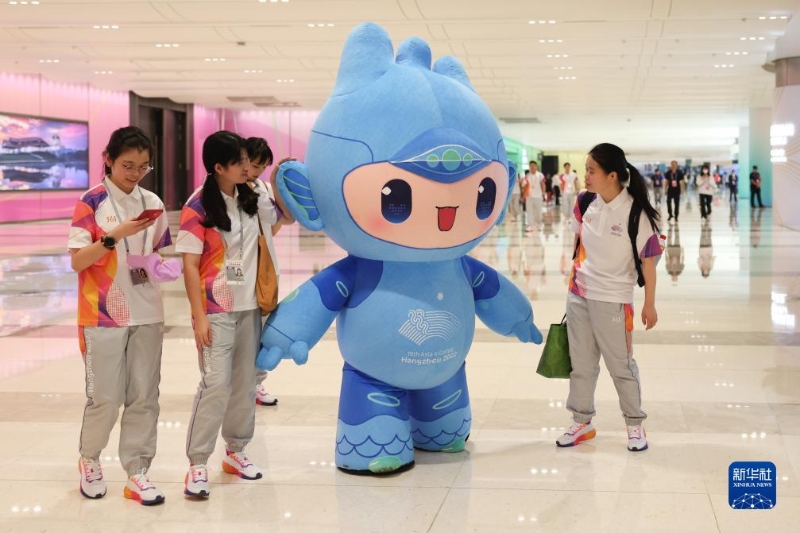 9月18日,在杭州亞運(yùn)會主媒體中心,吉祥物宸宸和工作人員在一起。