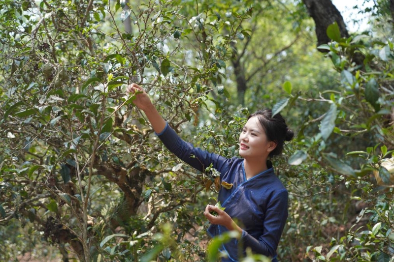 4月19日,當?shù)卮迕裨诰斑~大寨古茶林采摘春茶。新華社發(fā)(盧磊 攝)