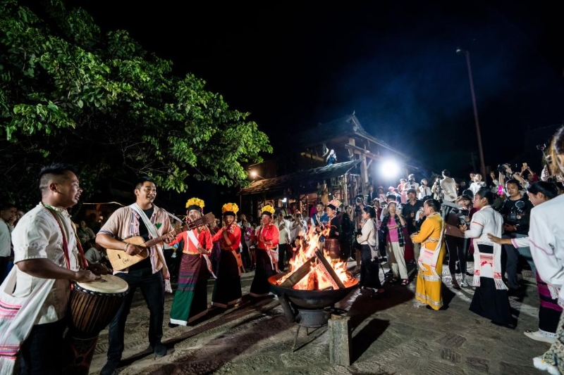 9月17日,在景邁山翁基古寨,人們圍著篝火跳舞慶祝。新華社記者 胡超 攝
