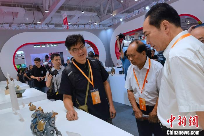 19日,臺灣陶藝師程逸仁(右三)介紹參展作品的創(chuàng)作理念。中新網(wǎng)記者 孫虹 攝
